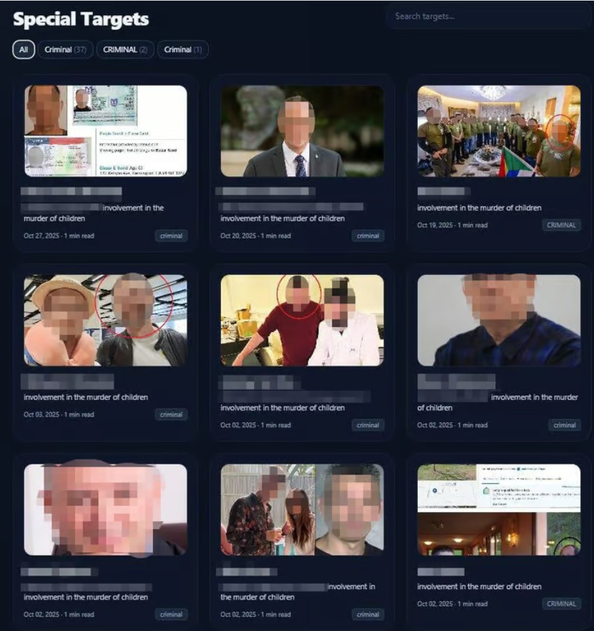 ووفق ما أفادت به صحيفة “يديعوت أحرونوت”، نشر الموقع، الذي يطلق على نفسه اسم "حركة العقاب من أجل العدالة" (The Punishment For Justice Movement)، تهديدات مباشرة ومفصلة تستهدف نخبة العلماء والباحثين الإسرائيليين، متهمًا إياهم بأنهم مجرمون وشركاء للجيش الإسرائيلي، ومسؤولون عن تطوير أسلحة الدمار الشامل، ومتورطون في قتل الأطفال الفلسطينيين.