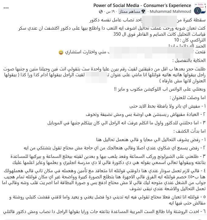 الشاب يُدعى “محمد محمود” (28 عامًا)، حكى ما حدث معه في “جروب” على موقع “فيسبوك”، حيث قال إن مشكلته بدأت حين علم بإصابته بمرض السكري بعد تسلمه نتائج تحاليله الطبية من أحد المختبرات، وبعدها لجأ لتطبيق الأطباء الشهير لحجز موعد للعرض على طبيب مختص.