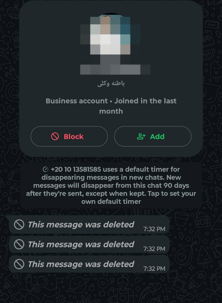 وتابع: "بعد مغادرتي المكان، حذف الطبيب جميع الرسائل على واتساب، وبعدها تواصلت مع التطبيق الطبي الشهير، وسردت شكواي كاملة، وأخبرني المسؤولون عن التطبيق أنهم متأكدون من عمله كطبيب، بسبب اطلاعهم على أوراقه الرسمية وجار التحقيق في الواقعة".