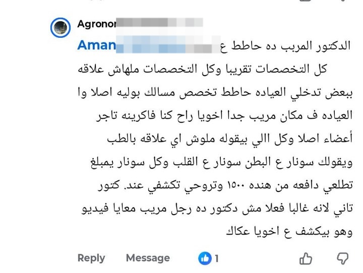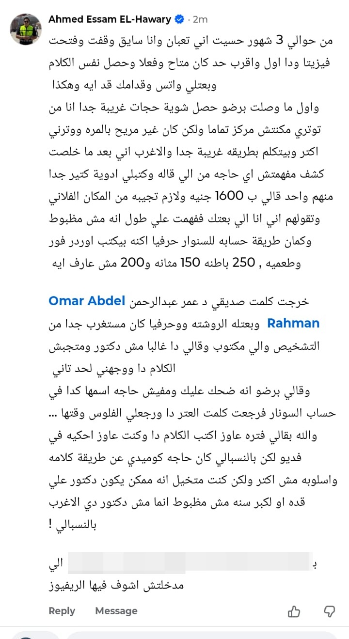 وتابع البوست واصفًا المكان: "مفيش أي بانر ولا يافطة بخط الإيد حتى، العيادة مفيهاش ريسبشن، هي أوضة بس ومش نظيفة وتخوف، لمّا المساعدة دخلتني للدكتور أول ما اتكلم عرفت إنه الراجل اللي كان بيتكلم جنبها في الموبايل".