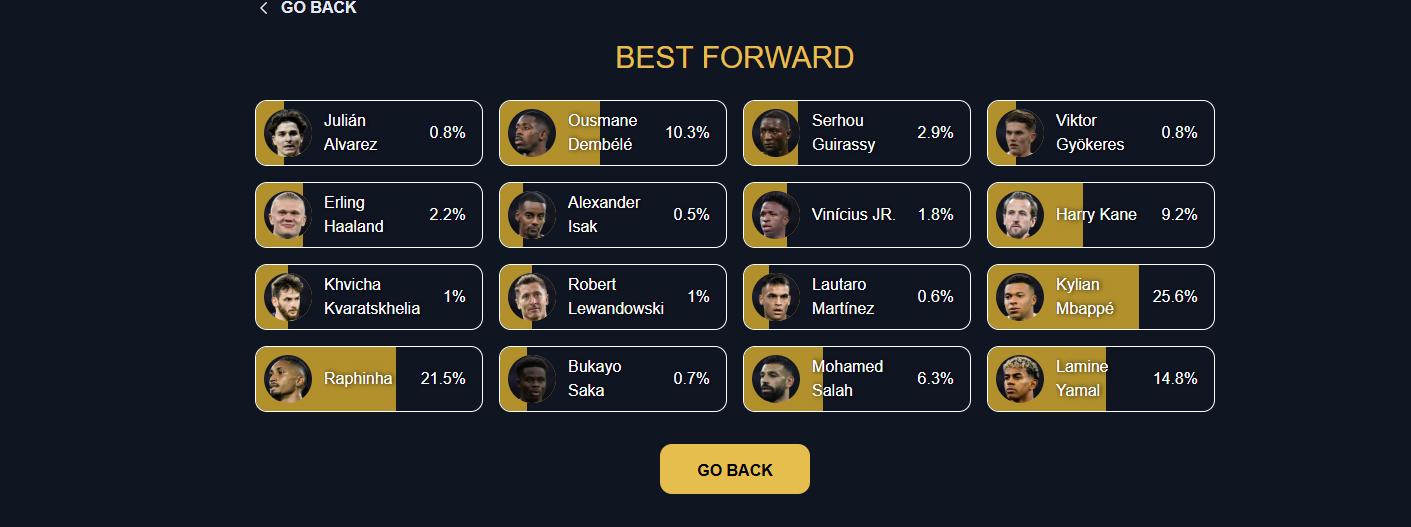 محمد صلاح (ليفربول)، عثمان ديمبلي (باريس سان جيرمان)، جيانلويجي دوناروما (مانشستر سيتي)، ديزيري دوي (باريس سان جيرمان)، فيكتور جيوكيريس (أرسنال)، إيرلينج هالاند (مانشستر سيتي)، أشرف حكيمي (باريس سان جيرمان)، ألكسندر إيزاك (ليفربول)، فينيسيوس جونيور (ريال مدريد)، هاري كين (بايرن ميونخ)، كفاراتسخيليا (باريس سان جيرمان)، روبرت ليفاندوفسكي (برشلونة)، لاوتارو مارتينيز (إنتر ميلان)، كيليان مبابي (ريال مدريد)، سكوت مكتوميناي (نابولي)، نونو مينديز (باريس سان جيرمان)، مايكل أوليس (بايرن ميونخ)، كول بالمر (تشيلسي)، بيدري (برشلونة)، رافينيا (برشلونة)، ديكلان رايس (أرسنال)، فابيان رويز (باريس سان جيرمان)، فيتينيا (باريس سان جيرمان)، فلوريان فيرتز (باير ليفركوزن)، لامين يامال (برشلونة).