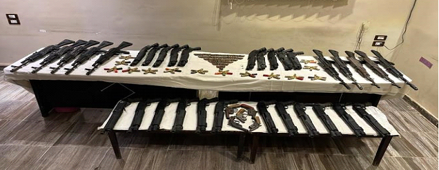 - الأسلحة: 98 قطعة سلاح ناري متنوعة، تشمل 22 بندقية آلية، 43 بندقية خرطوش، 29 فرد خرطوش، 3 طبنجات، ورشاش.