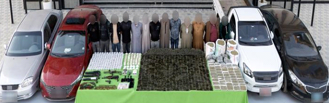 عُثِر بحوزة المتهمين على أكثر من 414 كيلوجرامًا من المواد المخدرة المتنوعة ("حشيش، هيدرو، شابو، أفيون، هيروين، شادو، بودرة حشيش اصطناعي")، وأكثر من 1300 قرص مخدر، و85 قطعة سلاح ناري متنوعة تشمل: 19 بندقية آلية، 25 بندقية خرطوش، 40 فرد خرطوش، وطبنجة.