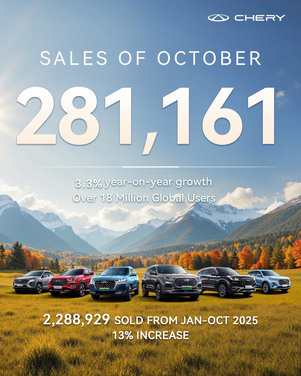 وخلال الفترة من يناير إلى أكتوبر، حققت مجموعة شيري مبيعات تراكمية بلغت 2,288,929 سيارة، بزيادة سنوية قدرها 13% محققة رقماً قياسياً جديداً للفترة.
