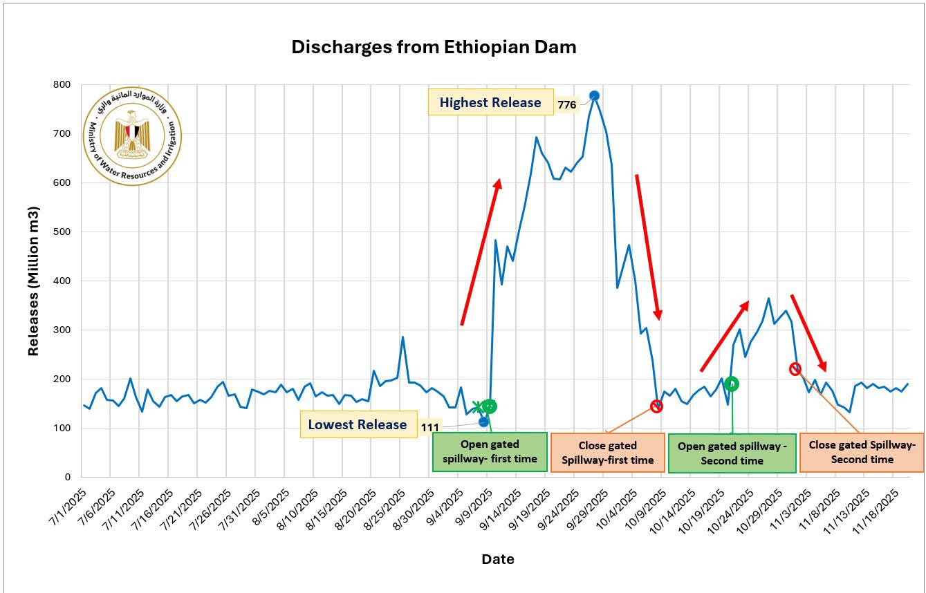 دفعت الإجراءات غير المسؤولة لـ إثيوبيا، بشأن تشغيل سد النهضة، في اتخاذ الدولة المصرية قرارات عاجلة للسيطرة على ارتفاع منسوب مياه نهر النيل، حسبما أفاد بيان وزارة الموارد المائية والري.