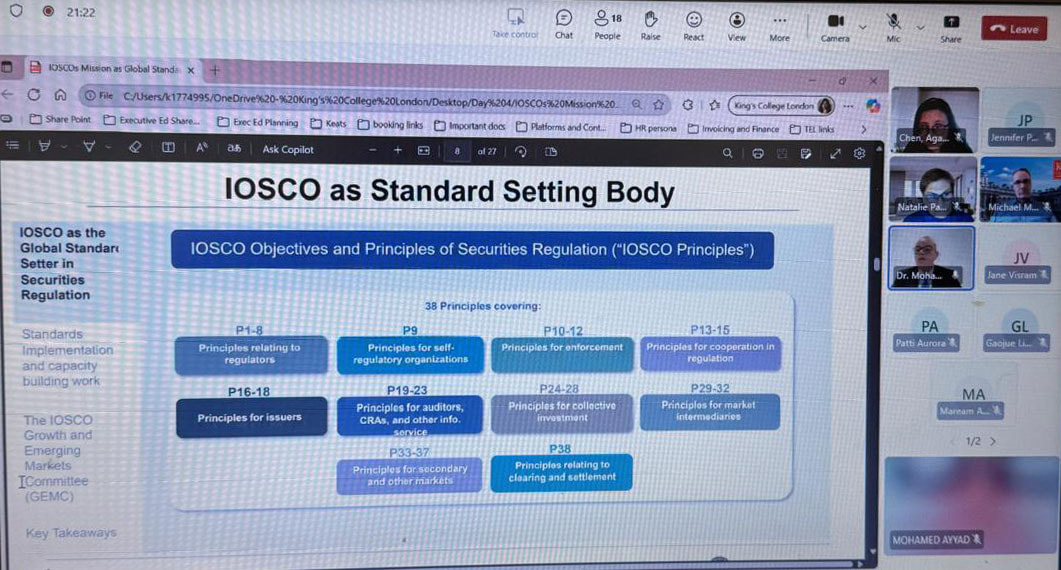 ألقى رئيس الهيئة العامة للرقابة المالية ورئيس لجنة الأسواق النامية والناشئة (GEMC) الدكتور محمد فريد، محاضرة افتراضية أمام المشاركين في البرنامج التدريبي الذي تنظمه كلية ديكسون بوون للقانون التابعة لكلية Kings College London، بصفته نائب رئيس المنظمة الدولية لهيئات الأوراق المالية (IOSCO).