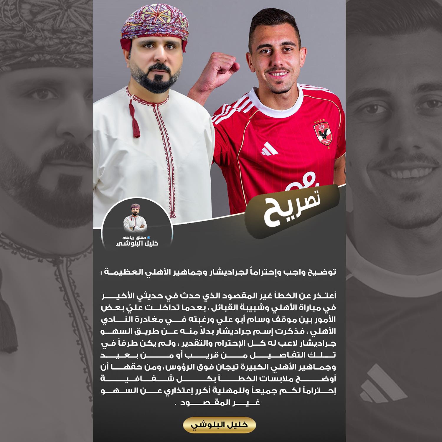 وعبر حساباته الرسمية، نشر خليل البلوشي بيانًا يوضح فيه حقيقة ما حدث، حيث قال: "توضيح واجب واحتراما لجراديشار وجماهير الأهلي العظيمة، أعتذر عن الخطأ غير المقصود في حديثي خلال مباراة الأهلي وشبيبة القبائل، بعدما اختلط عليّ الأمر بين موقف وسام أبو علي ورغبته في الرحيل، فذكرت اسم جراديشار بدلًا منه عن طريق السهو."