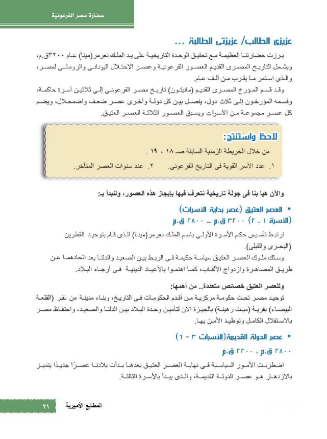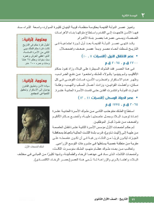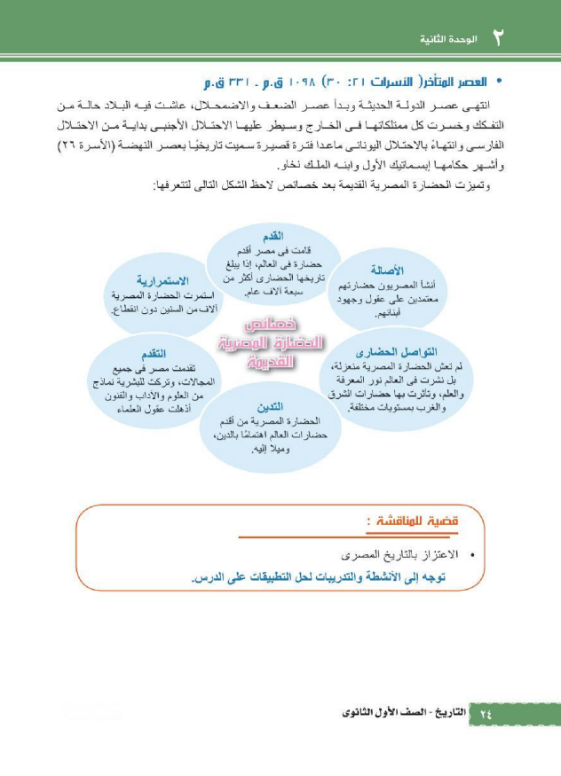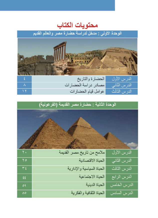 الوحدة الأولى بعنوان “مدخل لدراسة حضارة مصر والعالم القديم”