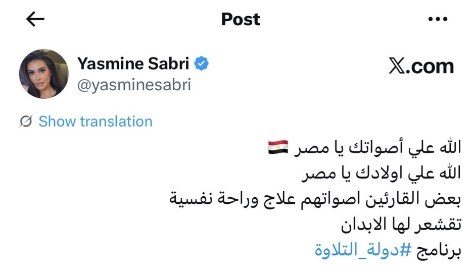بعد ساعات قليلة، نشرت الفنانة ياسمين صبري تغريدة عبر حسابها الرسمي على منصة “إكس”، أشادت فيها ببرنامج “دولة التلاوة”، في خطوة اعتبرها البعض ردًا غير مباشر على تصريحات والدها. وقالت: “الله على أصواتك يا مصر، الله على أولادك يا مصر، بعض القُرّاء أصواتهم علاج وراحة نفسية، تقشعر لها الأبدان، برنامج دولة التلاوة”.