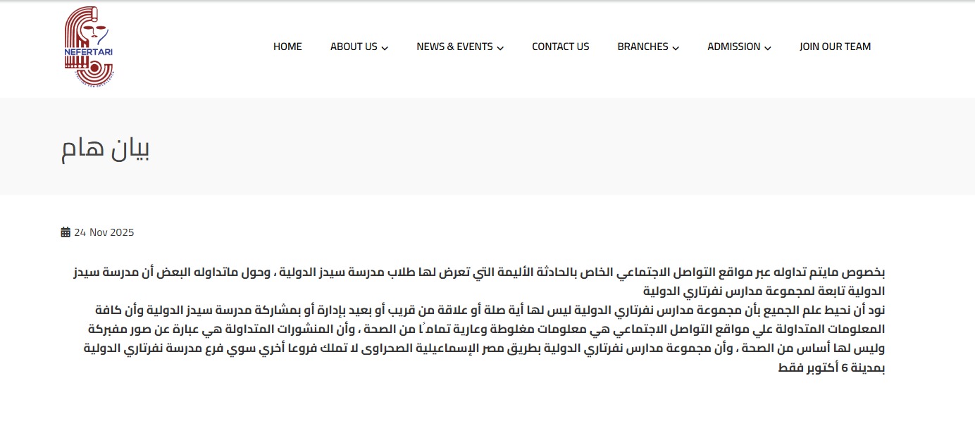 وأكدت مدرسة نيفرتاري الدولية خلال البيان أنها لا تمتلك أي فروع آخري سوى؛ فرع المدرسة بمدينة 6 أكتوبر بالجيزة، بجانب فرعها الأساسي بطريق مصر الإسماعلية الصحراوي.