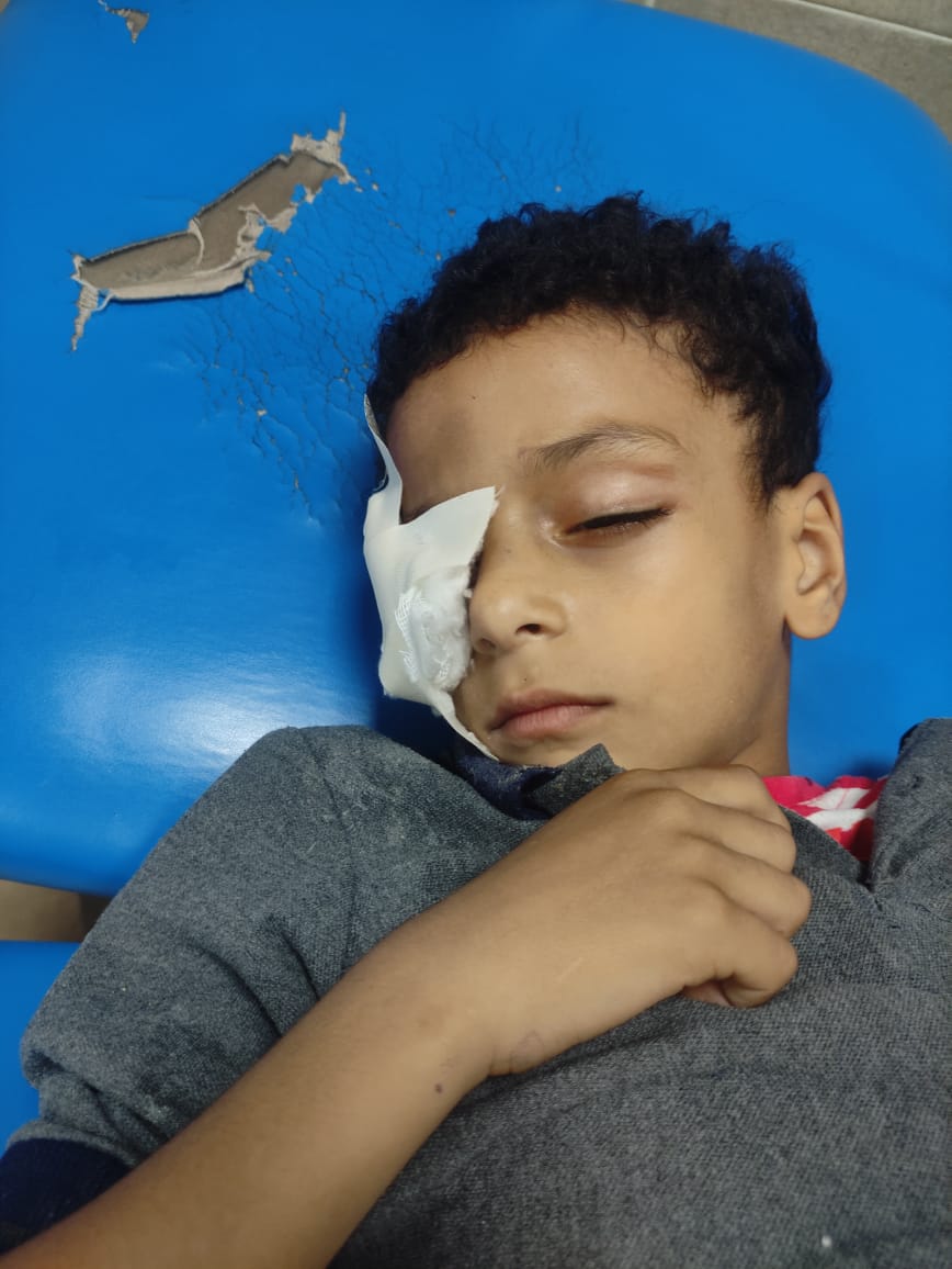 وبحسب أسرة الطفل، فإن نجلهم، عمر ياسر محمد؛ طالب أولى ابتدائي؛ عاد إلى المنزل وهو يعاني من ألم شديد وتورم حاد في إحدى عينيه، قبل أن تتدهور حالته سريعًا، وعقب نقله إلى المستشفى، أكد الأطباء تعرّض العين لإصابة بالغة أسفرت عن «تصفية» قرنية عينه.