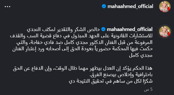 وكتبت مها أحمد عبر حسابها الرسمي على منصة “إنستجرام”: “هذا الحكم يؤكد أن العدل بيظهر مهما طال الوقت، وإن الدفاع عن الحق باحترافية وإخلاص بيصنع الفرق.. شكرًا لكل من ساهم في تحقيق النتيجة دي”.