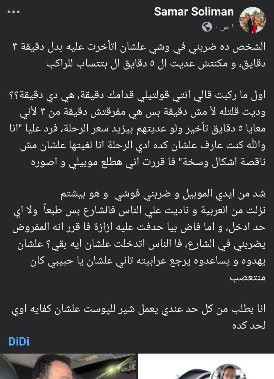 نشرت سيدة تُدعى سمر سليمان على حسابها عبر فيسبوك منشورًا أرفقت به صورة لأحد السائقين، في إحدي شركات النقل الذكي متهمة إياه بالاعتداء عليها بالضرب داخل الشارع بسبب تأخرها دقائق معدودة عن موعد انطلاق الرحلة.