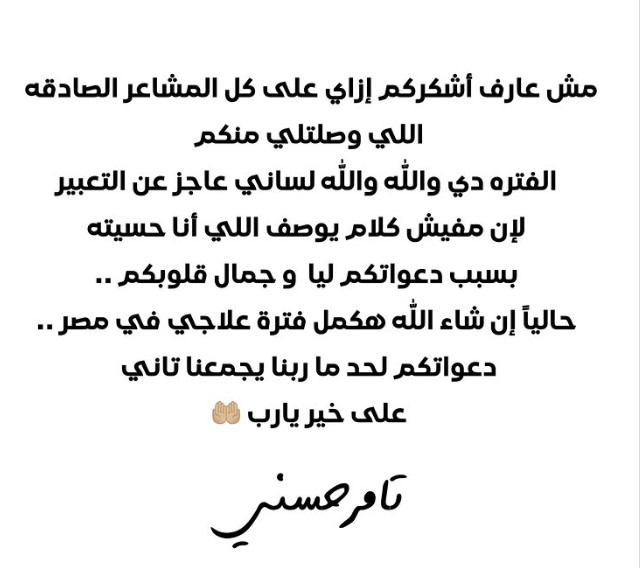وقال تامر حسني في بيانه: "مش عارف أشكركم إزّاي، على كل المشاعر الصادقة اللي وصلتني منكم الفترة دي، والله والله لسّا لساني عاجز عن التعبير، لأن مفيش كلام يوصف اللي أنا حسيته بسبب دعواتكم لي، وجمال قلوبكم، حاليًا إن شاء الله، هكمّل فترة علاجي في مصر، دعواتكم لحد ما ربنا يجمعنا تاني على خير يارب".