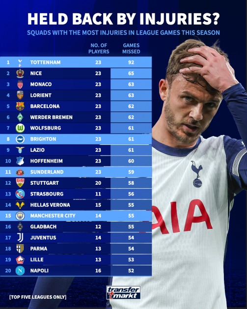 نشرت منصة ترانسفير ماركت تقريرًا عن أبرز الأندية الأوروبية التي تأثرت بغياب لاعبيها بسبب الإصابات منذ بداية الموسم، وجاء نادي توتنهام الإنجليزي في الصدارة.