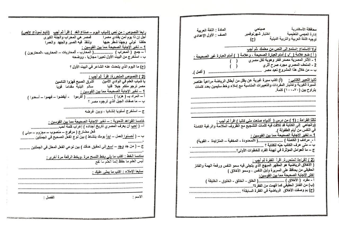 امتحان شهر نوفمبر للصف الأول الإعدادي