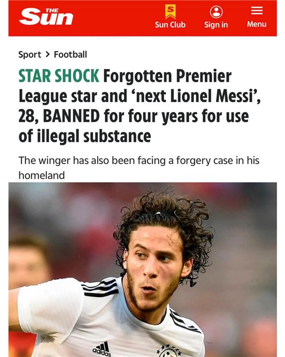 سلطت تقارير صحفية بريطانية الضوء على إيقاف رمضان صبحي نجم نادي بيراميدز لأربع سنوات بقرار من المحكمة الرياضية الدولية "كاس" بعد ثبوت مخالفته لوائح مكافحة المنشطات.