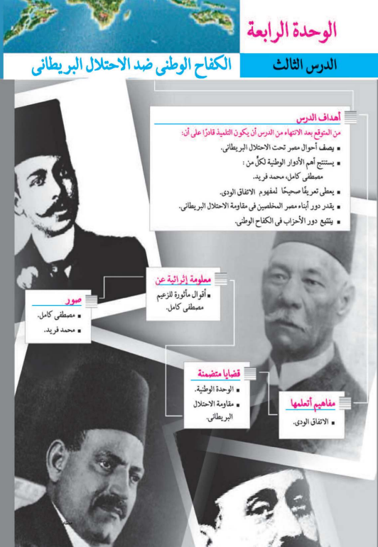 يتحدث الدرس عن فترة الكفاح الوطني ضد الاحتلال البريطاني موضحًا ما مرت به مصر من أحداث مهمة أثناء الاحتلال، وكيف تغيّرت أحوال البلاد سياسيًا واقتصاديًا واجتماعيًا، كما يستعرض الدرس الدور البارز الذي قام به الزعيمان مصطفى كامل ومحمد فريد في إحياء الروح الوطنية بين المصريين والدفاع عن حقوق الوطن، ويبرز الدرس جهود أبناء الشعب المخلصين في مقاومة الاحتلال، إضافة إلى تتبع دور الأحزاب السياسية في قيادة الحركة الوطنية وتوحيد الصفوف من أجل نيل الحرية والاستقلال.