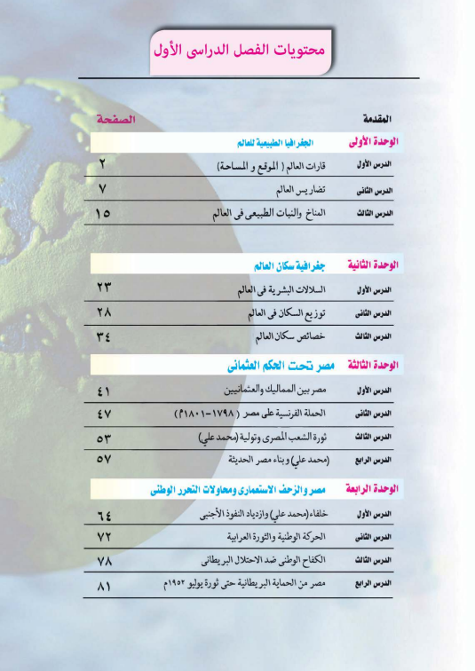 وفيما يخص منهج مادة الدراسات الاجتماعية للصف الثالث الإعدادي فهو يتكون من 4 وحدات أساسية تتناول أحداث تاريخية مهمة، وتأتي الدروس على النحو التالي: