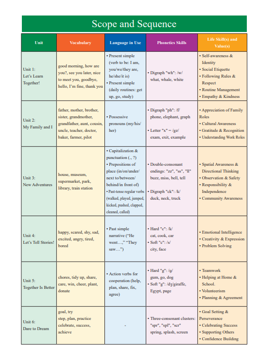 وفيما يخص منهج اللغة الإنجليزية للصف الثالث الابتدائي فهو يحتوي على 6 وحدات رئيسية وهي كالتالي: