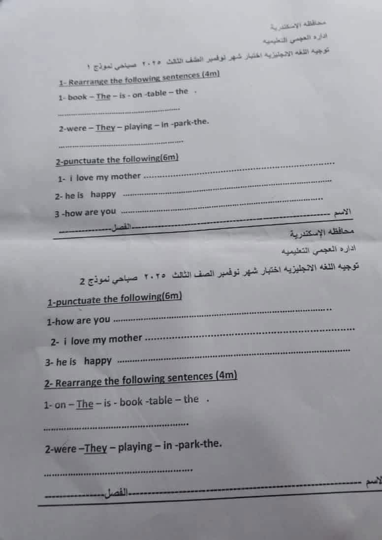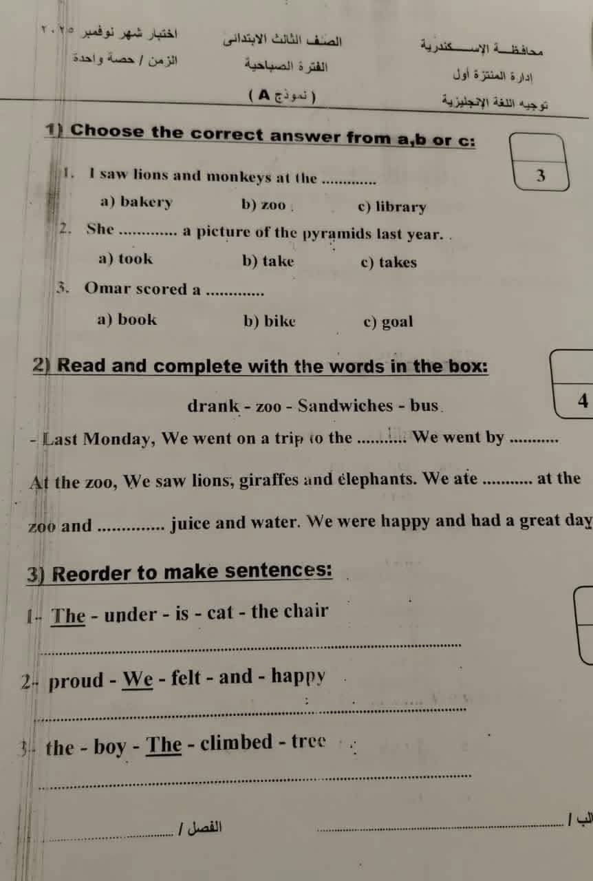 نماذج امتحانات إنجليزي للصف الثالث الابتدائي 2025-2026