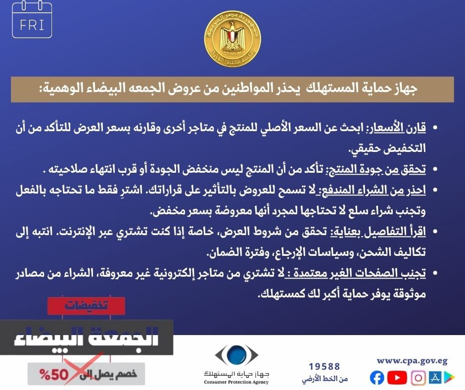 جدد جهاز حماية المستهلك دعوته للمواطنين بضرورة توخي الحذر عند التعامل مع عروض التخفيضات والمشتريات، سواء عبر المنصات الإلكترونية أو داخل المحال التجارية، وذلك حفاظًا على حقوقهم وضمانًا لشفافية المعاملات خلال موسم "الجمعة البيضاء".