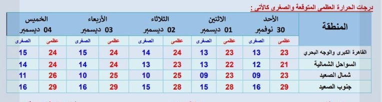 ويمكن أن نستعرض توقعات الهيئة العامة للأرصاد الجوية لدرجات الحرارة العظمى والصغرى في مختلف مناطق الجمهورية خلال الأيام القادمة من خلال الصورة التالية: