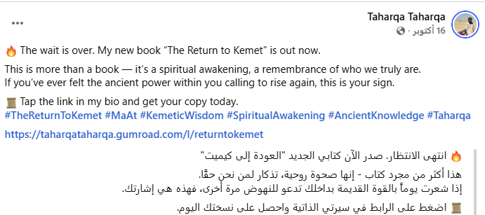 وأعلن في منشور سابق نشره لكتابه بعنوان العودة إلى كيميت، لبث مزاعمه عن الحضارة المصرية، وعلق: "هذا أكثر من مجرد كتاب، إنها صحوة روحية، تذكار لما نحن".