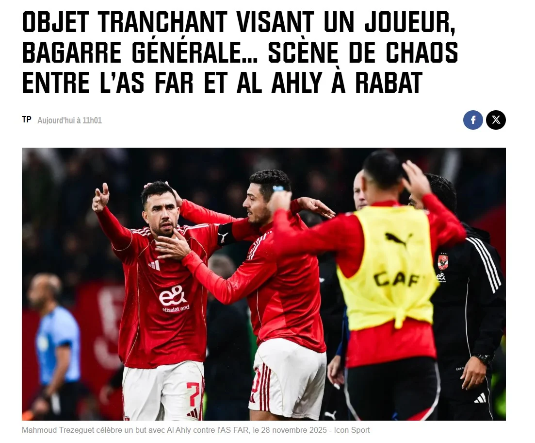 سلط موقع "RMC Sport" التابع لراديو مونت كارلو الفرنسي الضوء على الأحداث المؤسفة التي شهدتها مباراة الجيش الملكي المغربي وضيفه الأهلي المصري، والتي جرت مساء الجمعة على استاد "مولاي الحسن" بالرباط، ضمن منافسات الجولة الثانية من مرحلة المجموعات لدوري أبطال إفريقيا.