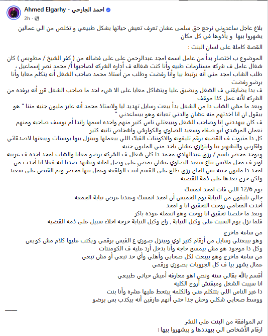 تباشر الأجهزة الأمنية بوزارة الداخلية فحص واقعة استغاثة تم تداولها عبر موقع فيسبوك، تتعلق بتعرض فتاة تُدعى سلمى لحملة ابتزاز وتشهير منذ أكثر من عام ونصف، على يد شاب كان يعمل معها في إحدى الشركات، بعد رفضها الارتباط به.