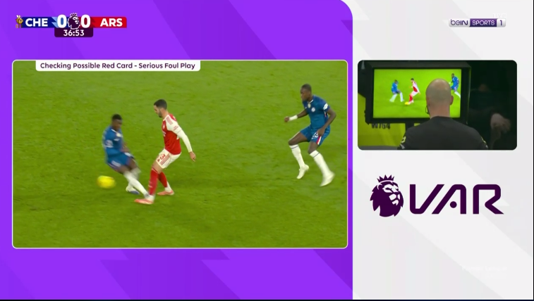 الدقيقة 38: أطلق حكم المباراة البطاقة الحمراء لكايسيدو، لاعب تشيلسي، بعد تدخل عنيف على ميرينو، لاعب أرسنال.