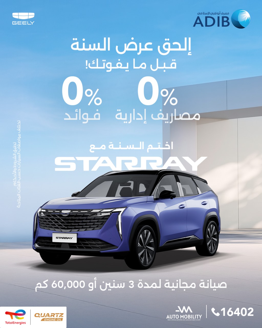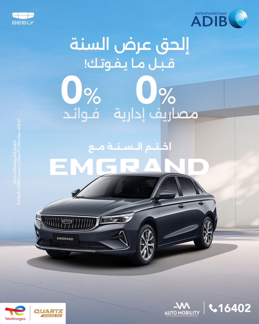 أعلنت شركة أوتوموبيلتي، الوكيل الرسمي والمُصنَّع الحصري لسيارات جيلي في مصر، عن عرض تمويلي حصري مميز لعملاء العلامة الصينية المرموقة، بالتعاون مع مصرف أبوظبي الإسلامي (ADIB) الذي يُقدِّم باقة متنوِّعة مِن الخدمات التمويلية المتوافقة مع الشريعة الإسلامية.