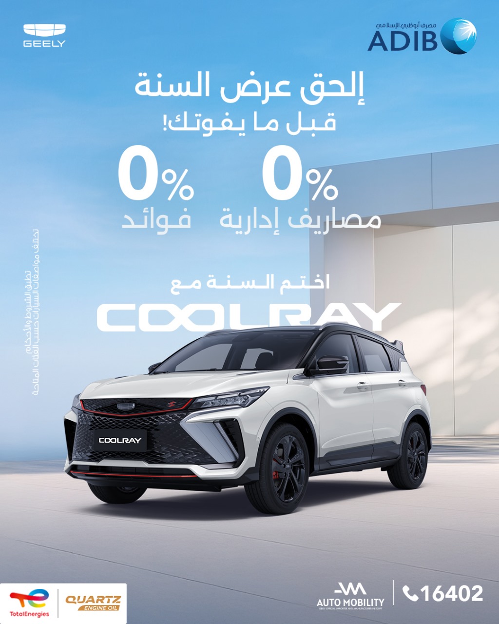بدون فوائد، تفاصيل عرض أوتوموبيلتي لتمويل سيارات جيلي مع مصرف أبوظبي الإسلامي