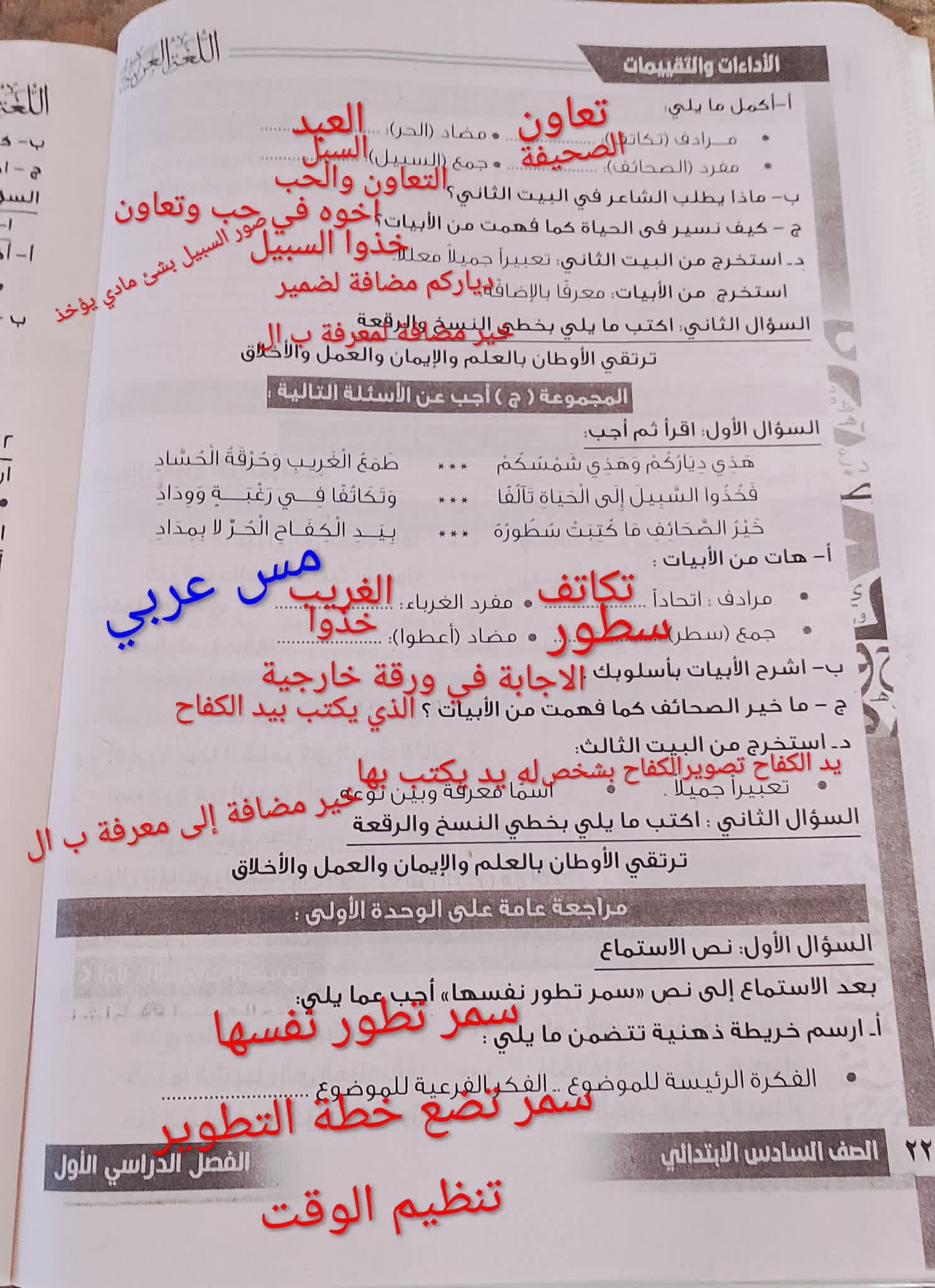 حل كتاب التقييمات للصف السادس الابتدائي اللغة العربية