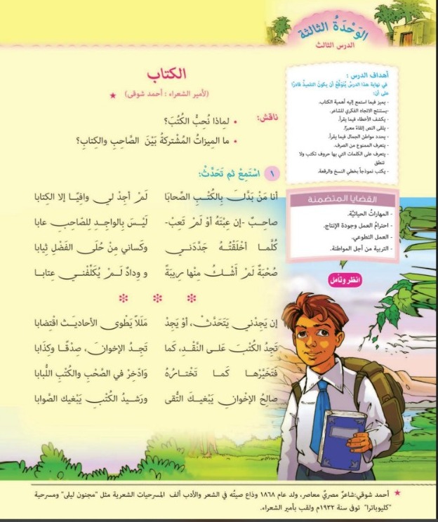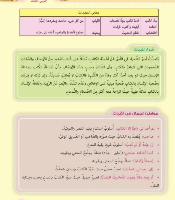 ويعد درس الكتاب هو الثالث في الوحدة الثالثة لمادة اللغة عربية للصف الثالث الإعدادي الفصل الدراسي الأول للعام الدراسي 2025-20256، حيث يعد من دروس المحفوظات، والتي يجب أن يحفظها الطالب وكذلك حفظ معان الكلمات الخاصة بنص المحفوظات.