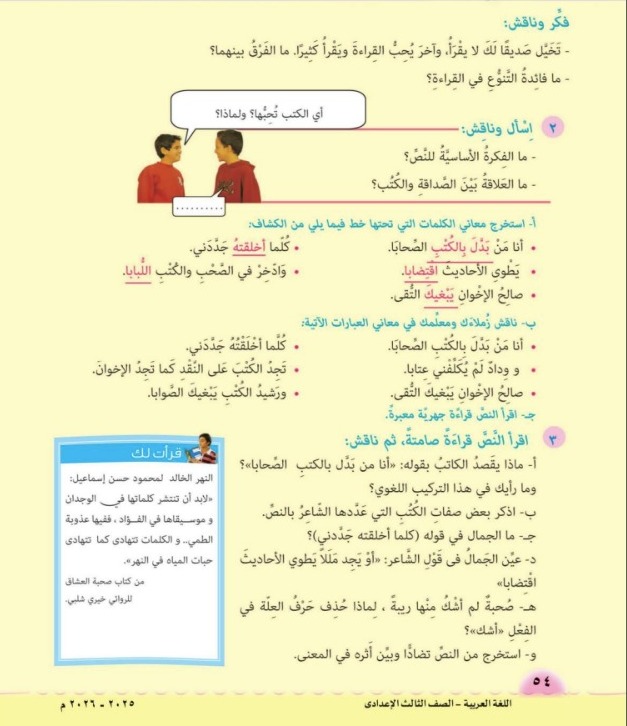 ويتحدث درس الكتاب للصف الثالث الإعدادي، عن الكتب ولماذا نحبها، وكذلك عن المميزات المشتركة بين الصحاب والكتب.