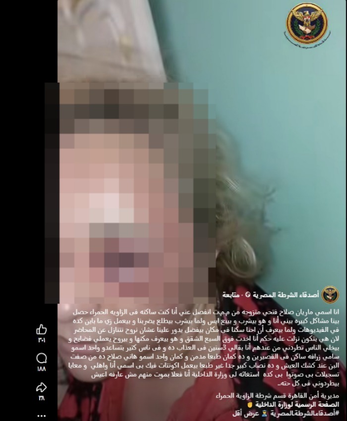 وقال ماريان بمنشور لها على صفحة أصدقاء الشرطة بموقع فيسبوك: "أنا متزوجه من واحد اسمه م.م.ت، وانفصل عني أنا كنت ساكنه فى الزاويه الحمراء وحصل بينا مشاكل كبيرة بسبب أنه بيشرب ويبيع مخدر الآيس ولما بيشرب بيطلع يضربنا".