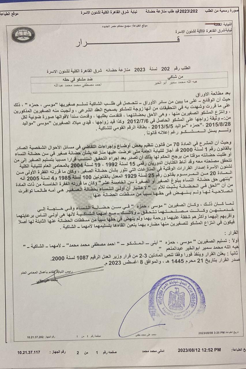 وقالت هبة، على الرغم من كل الإجراءات القانونية، لا يزال طفلي الكبير بعيدًا عني، وأتوجه بالنداء إلى المسؤولين لإعادة أولادي ورفع الظلم عني، قائلة: "أنا رجعت ابني الصغير، لكن ابني الكبير مش معايا أعمل إيه اكلم مين من المسؤولين أنا بستغيث بيهم كلهم "
