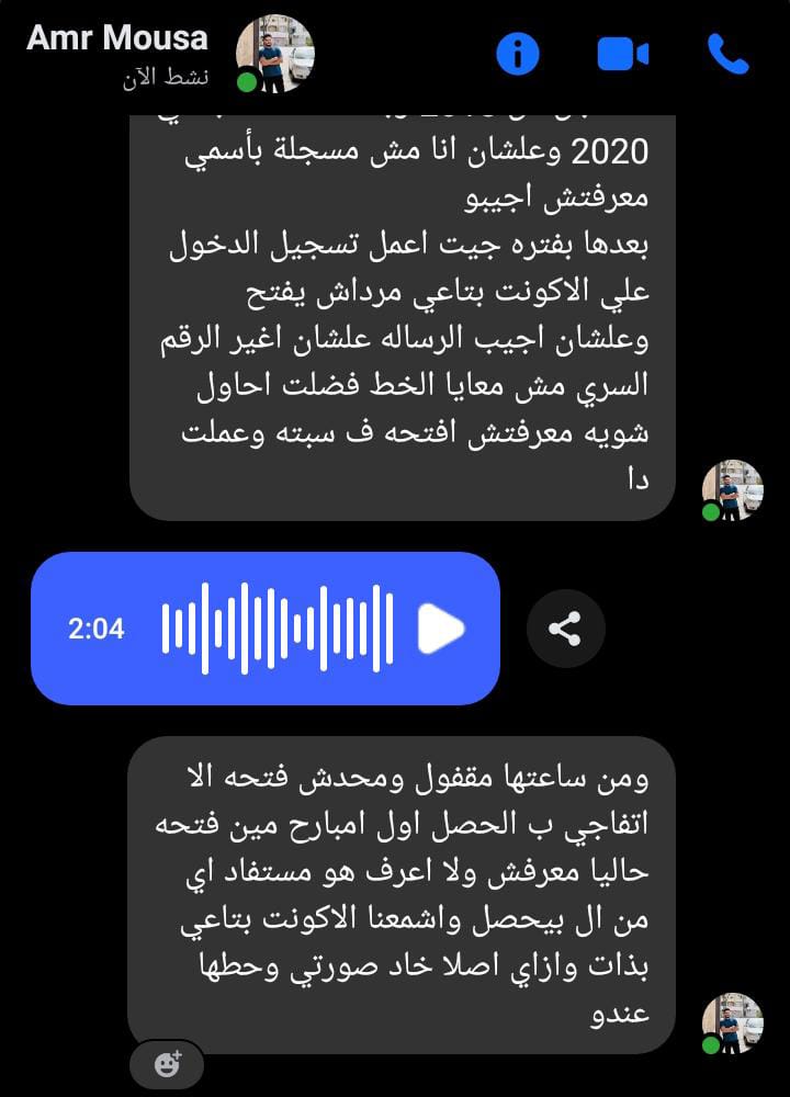 وأوضح أن هذا الحساب لم يُنشر عليه أي شيء سوى منشور فسخ الخطوبة منذ 2020، كما استخدم السارق صورته الشخصية الذي نشرها على حسابه الحالي في 6 يونيو 2025، ونُشرت على “الأكاونت القديم” بيوم 9 يونيو بنفس الشهر ـ وبحسب ما قال ـ فإنه حاول الدخول على هذا الحساب من حسابه الحالي لكنه لم يتمكن، فالشخص الذي استولى على الحساب حظره وهو ما أثار شكوكه بشأن نية السارق، متابعًا: "دخلت على الحساب القديم لقيته عاملي بلوك من الأكاونت الجديد بتاعي".