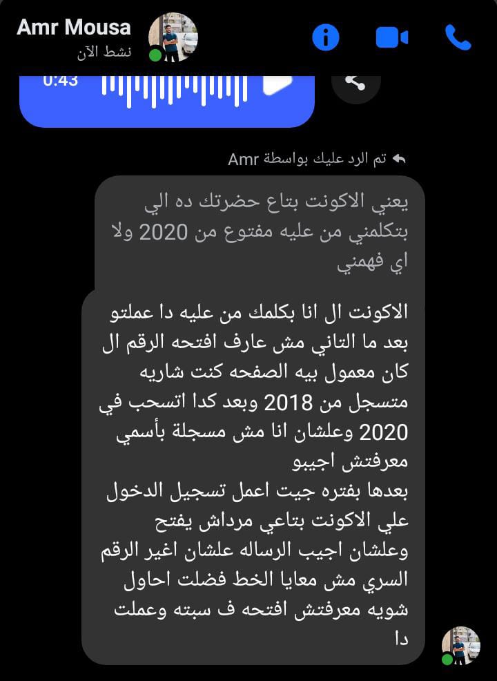 وتواصل الشاب عمرو موسى مع "تليجراف مصر"، نافيًا تمامًا كل ما نشر بالأمس، وكل التصريحات التي أُخذت باسمه، موضحًا حقيقة الأمر، وقال إن الحساب الذي ظهر باسمه يعود بالفعل له، لكنه سرق منه عام 2020، بعدما فتحه بـ 2018، قائلاً: "عمري ما خطبت والأكاونت دا كان بتاعي ومقفول من 2020".