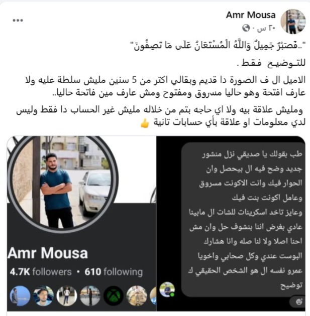 وتابع عمرو موسى: “أنه فتحت حساب جديد على منصة فيسبوك منذ 2020، وتفاجأت بالأمس بتداول اسمي على مواقع التواصل الاجتماعي، بمنشور يتضمن فسخ خطوبتي من فتاة على حسابي القديم الذي كنت أمتلكه”.