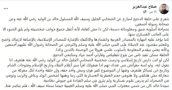 وانتقد بعض مستحدمي مواقع التواصل الاجتماعي المختلفة حلقة الدحيح الجديدة التي فتحت شهيتهم للانتقاد، زاعمين أنه تحدث عن الصحابي الجليل خالد بن الوليد من منظور تاريخي فقط وباعتباره قائدًا عسكريًا فحسب، ولم يتطرق إلى دوره الديني المؤثر.