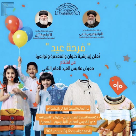 أعلنت إيبارشية حلوان والمعصرة بالكنيسة القبطية الأرثوذكسية، افتتاح معرض "فرحة عيد" لتقديم الملابس والأحذية لكل الأعمار بجودة ممتازة وبأسعار مدعَّمة، وذلك استمرارًا لرسالة الكنيسة في خدمة المجتمع وتخفيف الأعباء عن أبنائها.