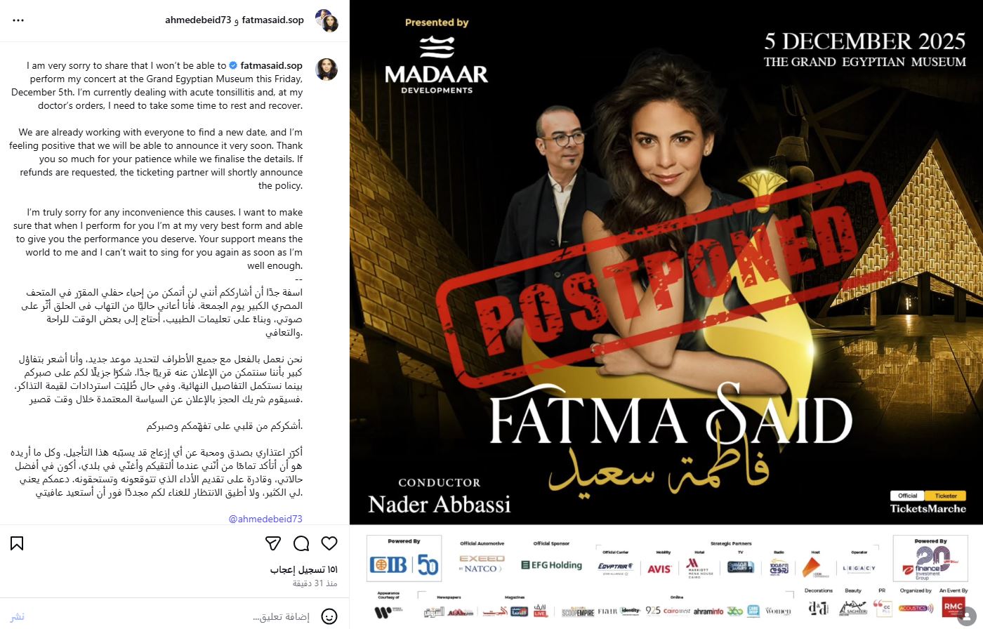 وكتبت فاطمة سعيد عبر حسابها الرسمي على “فيسبوك”: "آسفة جدًا أن أشارككم أنني لن أتمكن من إحياء حفلي المقرر في المتحف المصري الكبير يوم الجمعة، فأنا أعاني حاليًا من التهاب في الحلق أثّر على صوتي، وبناءً على تعليمات الطبيب، أحتاج إلى بعض الوقت للراحة والتعافي".