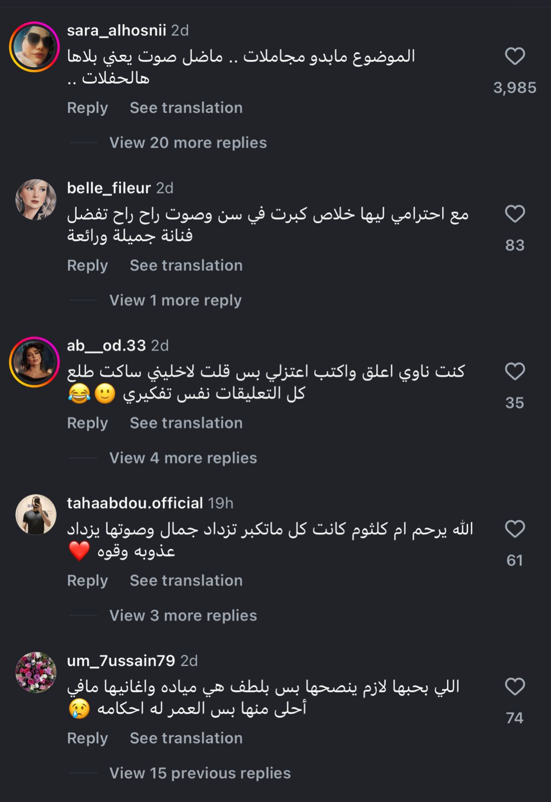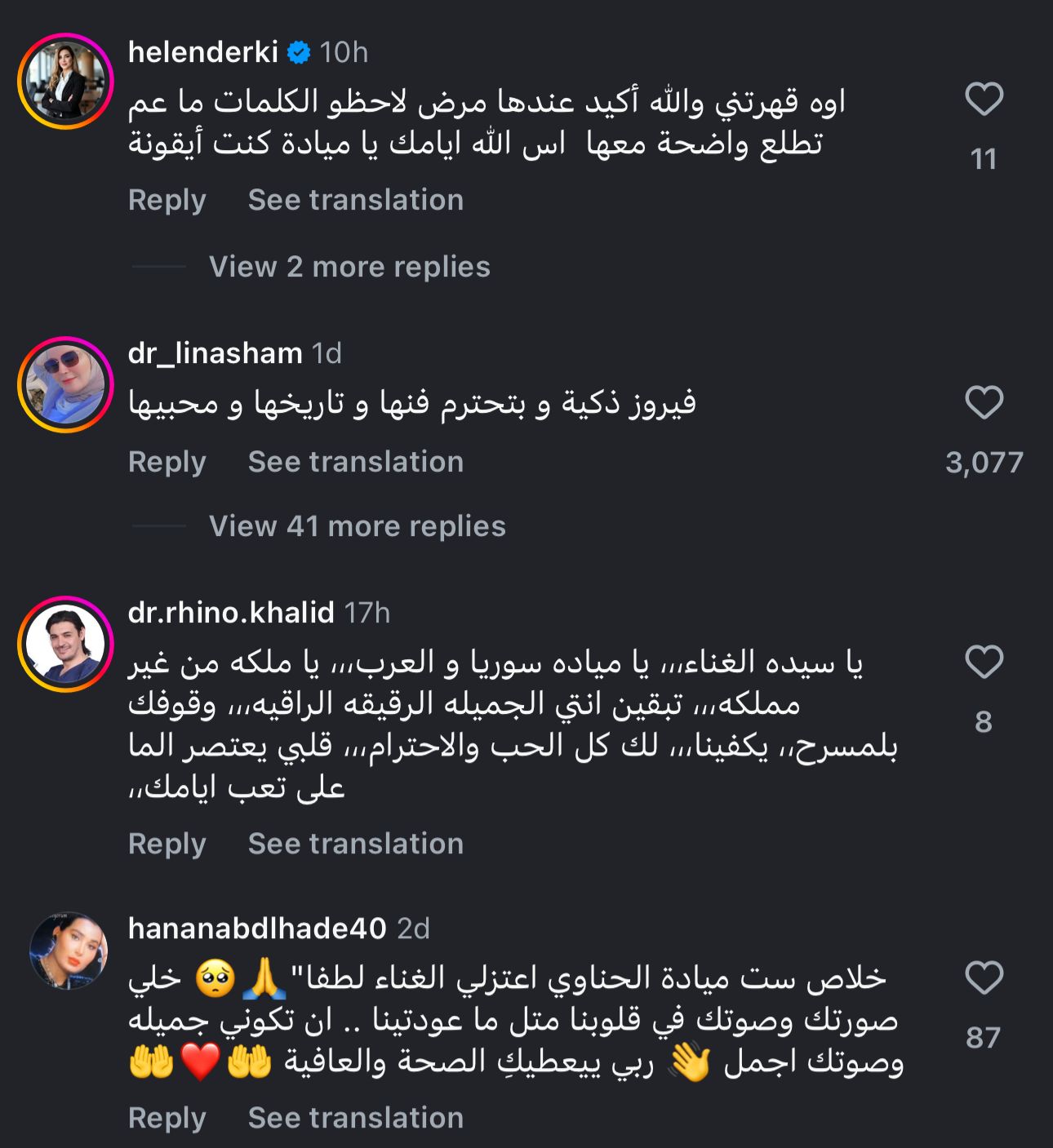 انهالت التعليقات على مقطع فيديو متداول في الحفل، ما بين الإيجابية والسلبية، وقارن البعض بين ميادة الحناوي وجارة القمر فيروز، التي امتنعت عن الظهور في حفلات مباشرة للجمهور خلال السنوات الأخيرة، فيما نصح آخرون ميادة الحناوي بالاعتزال، وجاءت التعليقات كالتالي: