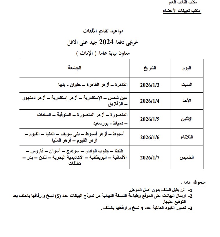 للإناث: يطلب الملف اعتباراً من يوم السبت الموافق 20/ 12/ 2025 وحتى يوم الخميس الموافق 25/12/ 2025 وتقدم الملفات إلى مكتب تعيينات أعضاء النيابة بدار القضاء العالي اعتبارًا من يوم السبت الموافق 3 / 1 / 2026 وحتى يوم الخميس الموافق 8/ 1/ 2026 من الساعة الثامنة صباحًا وحتى الساعة الرابعة مساءً يوميًا.