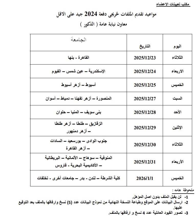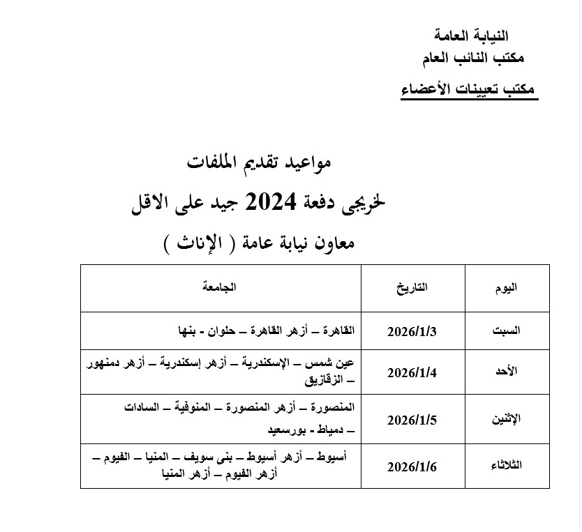 للذكور: يطلب الملف اعتباراً من يوم السبت الموافق 13 /12/ 2025وحتى يوم الخميس الموافق 18/12/ 2025، وتقدم الملفات إلى مكتب تعيينات أعضاء النيابة بدار القضاء العالي اعتبارًا من يوم الثلاثاء الموافق 23 / 12 /2025 وحتى يوم الخميس الموافق 1/ 1/ 2026 من الساعة الثامنة صباحًا وحتى الساعة الرابعة مساءً يوميًا.
