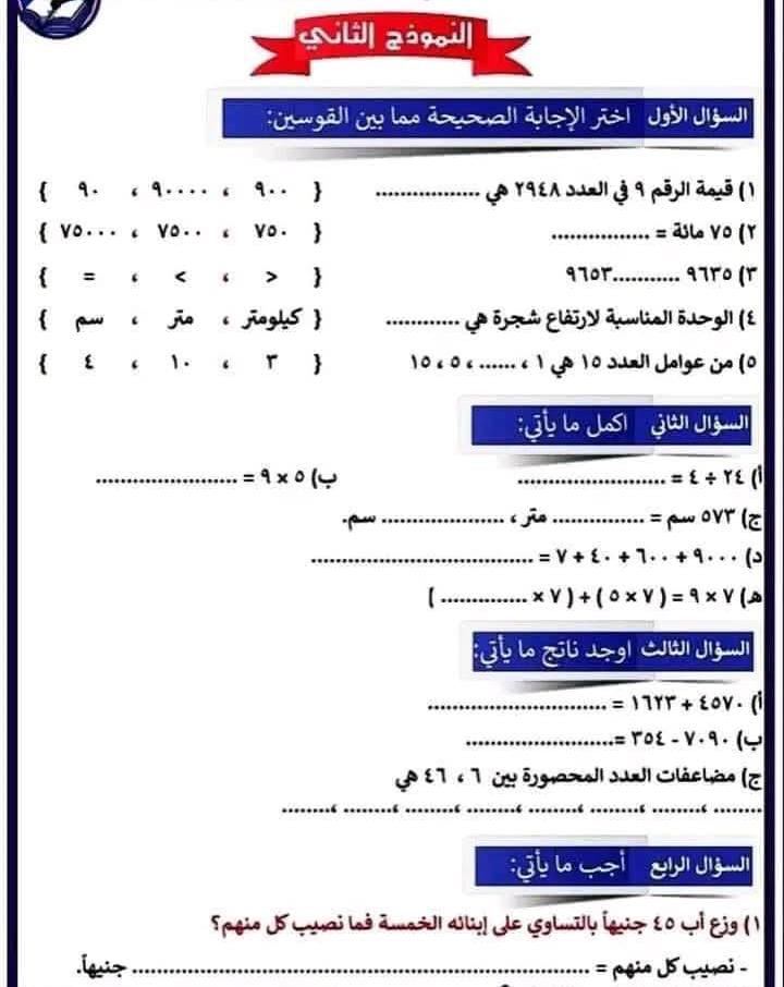 نماذج امتحانات الصف الثالث الابتدائي 2025-2026