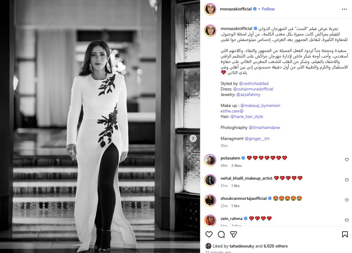 ونشرت منى زكي عبر حسابها على “إنستجرام”، صورًا من العرض الخاص لفيلمها الجديد "الست" في المهرجان الدولي للفيلم بمراكش، معربة عن سعادتها الكبيرة بالتجربة.