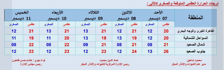 ويستطيع المواطنون الاطلاع على على درجات الحرارة المتوقعة خلال هذا الأسبوع حتى الخميس 11 ديسمبر 2025 في مختلف محافظات الجمهورية من خلال الصورة التالية: